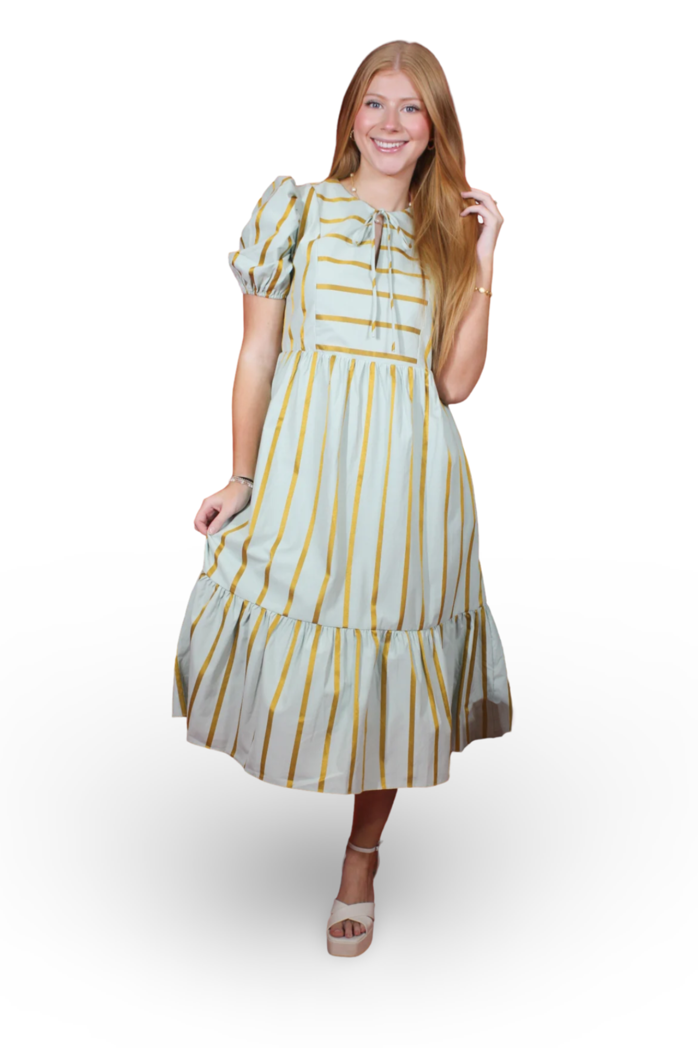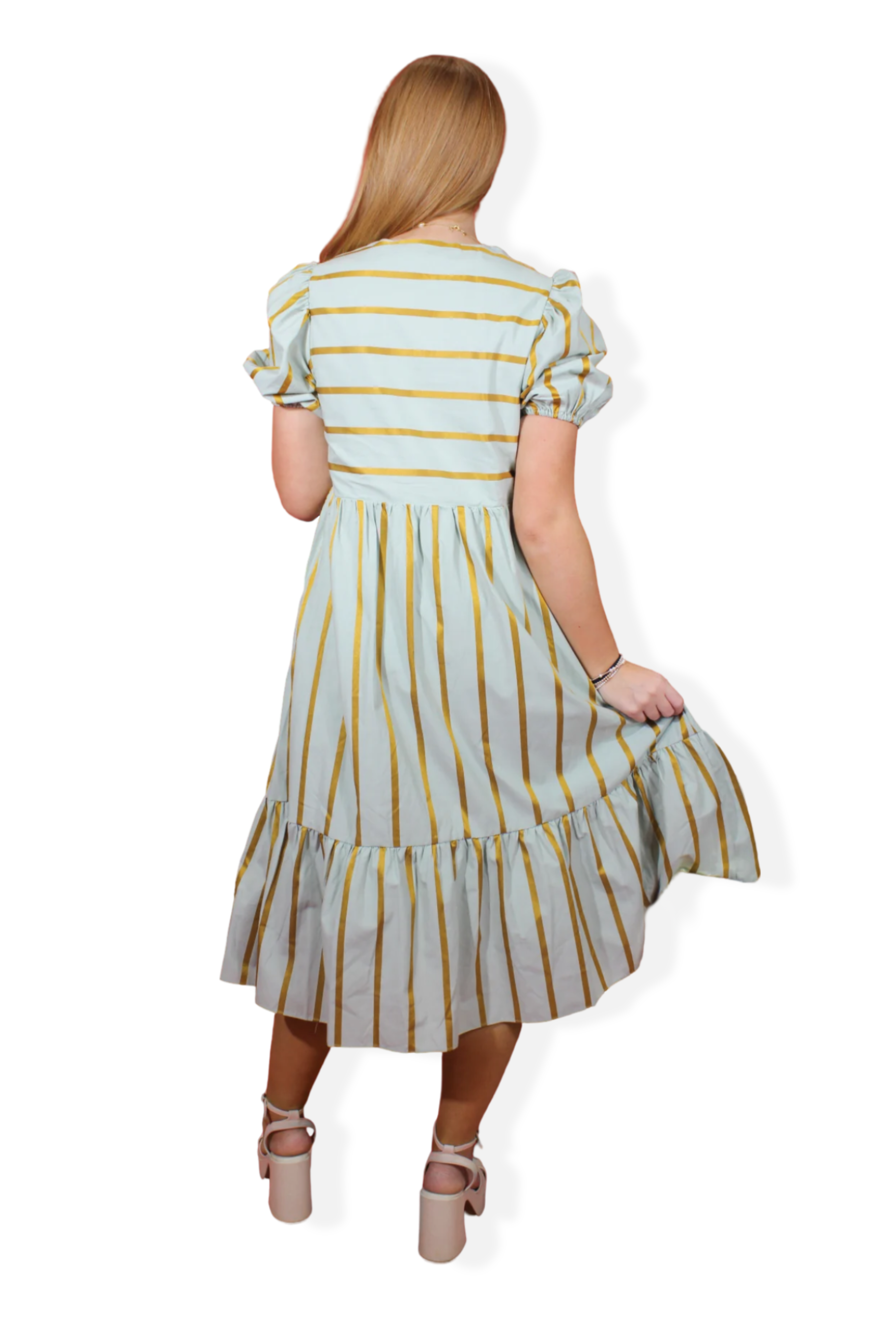 Courtney is 5’6 wearing a small.- Mint & Gold Midi.- Puff Sleeves.- Gold Stripes.