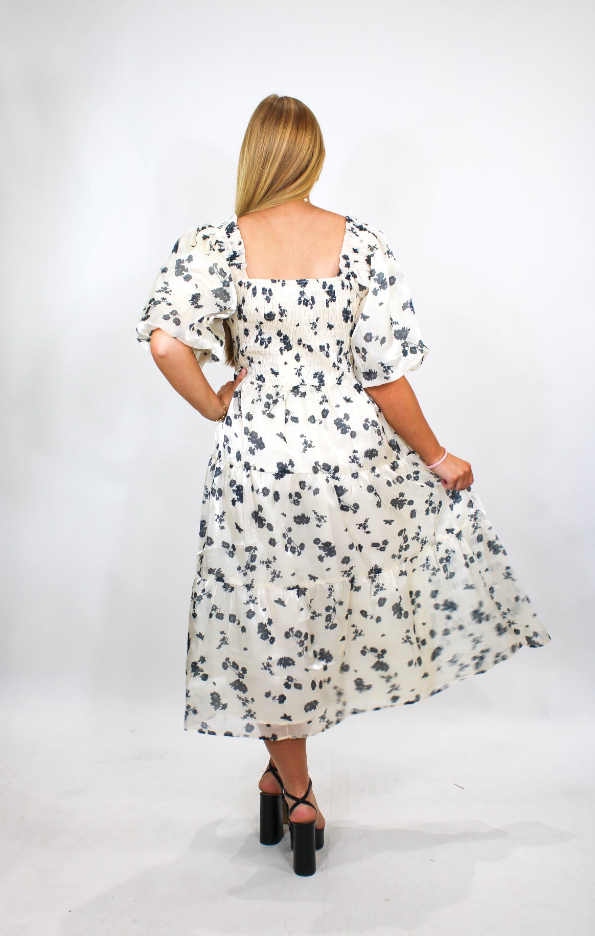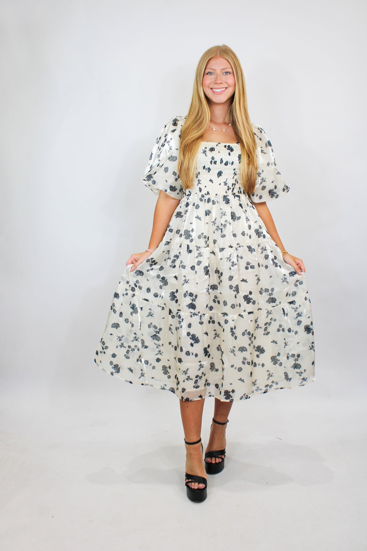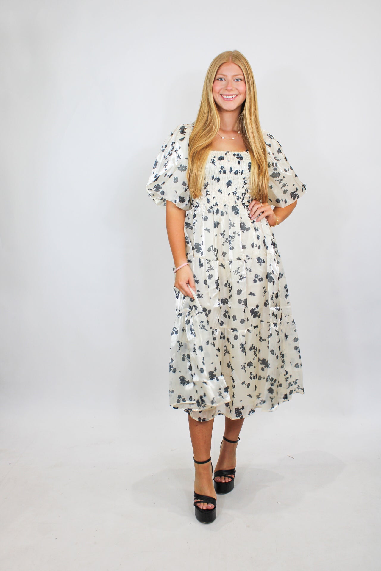 Courtney is 5’6 wearing a size small.- Puff Sleeve.- True Midi.- True to Size.